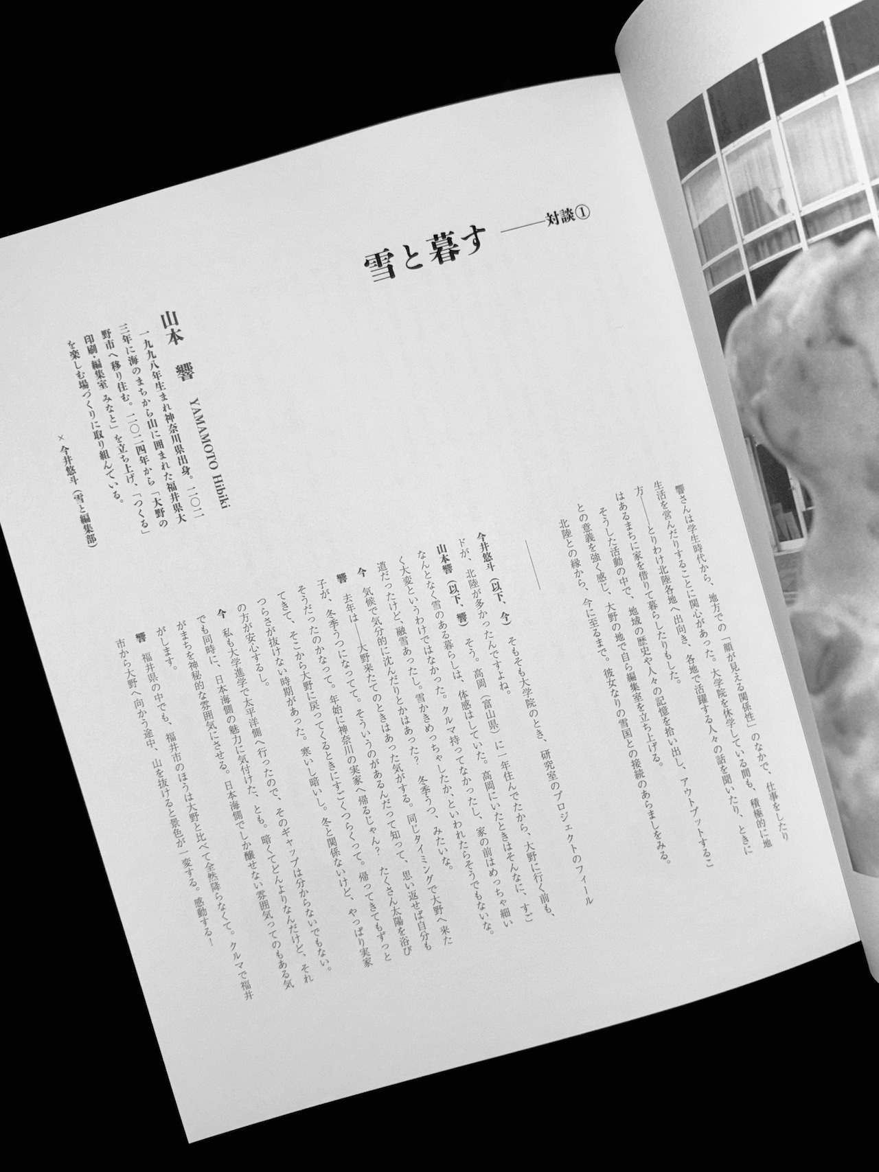 随想と対談に加え、今井による撮り下ろし写真を綴った作品集。複数の視座を幾度も行き来するうち、雪の概念は陰影と温度を纏い堆積する。これはたとえ夜明けの足跡や轍に潰えるものであれど、街場の雪をよろこび、したたかに暖をとるための手掛りのひとつとなるだろう。